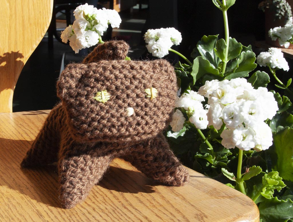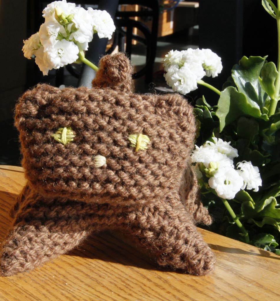 which bears no resemblance to Gina Michele’s Easy Plush Cat. Halt! Stop! Remember this is a "Don't be hard on yourself" zone. Okay ... Introducing one cute faced (do you know how hard it is for a perfectionist to embroidery two similar eyes on one knit stuffed toy?? Hmmm?) um, introducing one cute faced kitty and yet another finished project.